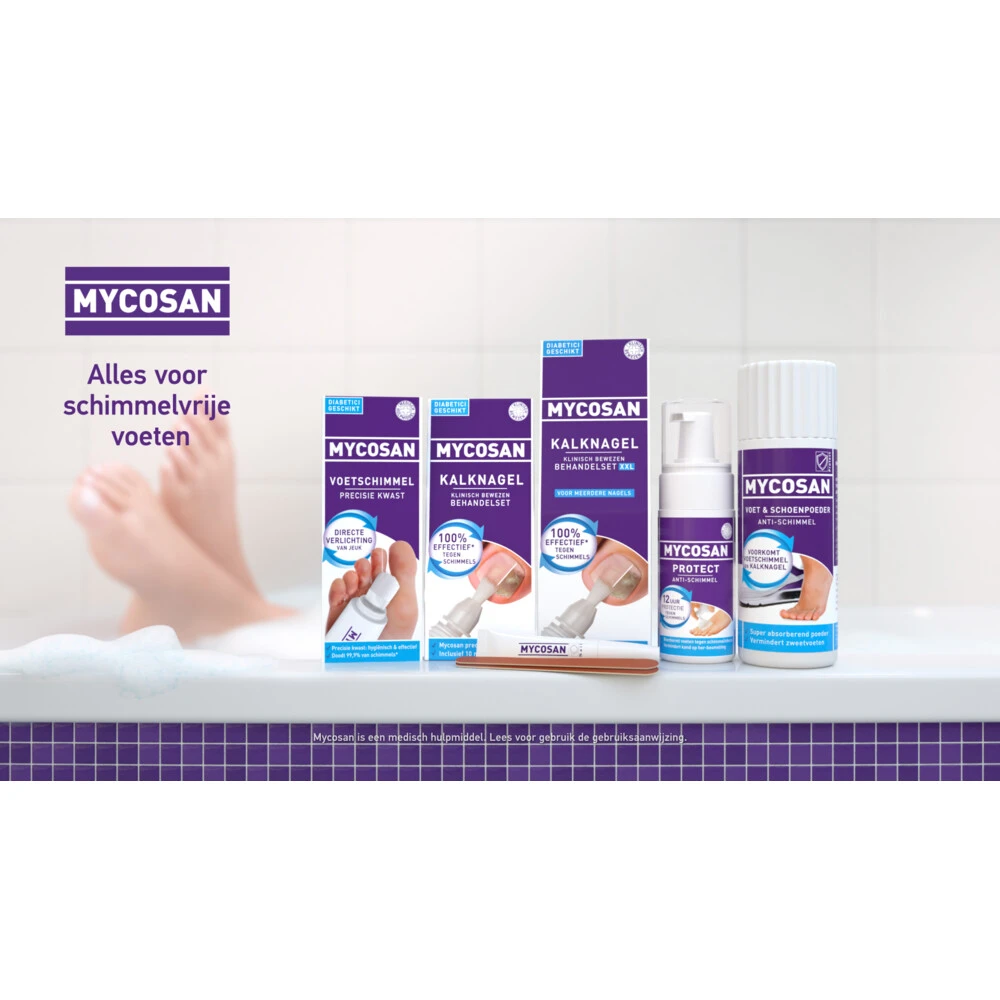 Mycosan Kalknagel + Voet & Schoenpoeder Combivoordeel PakketMycosan Anti Kalknagel-XL + Voet & Schoen Poeder Combivoordeel bevat een combinatie van de producten Mycosan Kalknagel XL en Mycosan Voet & Schoenpoeder. Het voetpoeder zorgt er niet alleen voor dat je (zweet)voeten fris en droog blijven, maar ook dat je minder kans hebt op (her)besmetting met schimmels. Met Mycosan Kalknagel XL kunt je snel, veilig en zeer doeltreffend kalknagels behandelen