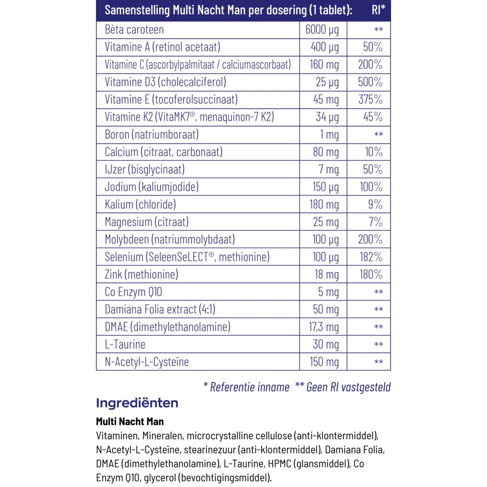 Vitakruid Multi Dag & Nacht ManVitakruid Multi Dag & Nacht Man is een formule op basis van het bioritme. Overdag, als je actief bent krijg je met Vitakruid Multi Dag & Nacht Man andere voedingsstoffen dan op het moment dat je slaapt. De tabletten geven energie voor overdag, rust voor de nacht. Verpakking bevat 2 x 30 tabletten.Twee tabletten voor optimaal dag- en nachtritme (bioritme)Uitsluitend de best opneembare vormenEen compleet vitamine B-complex voor het energieniveauGlutenvrij