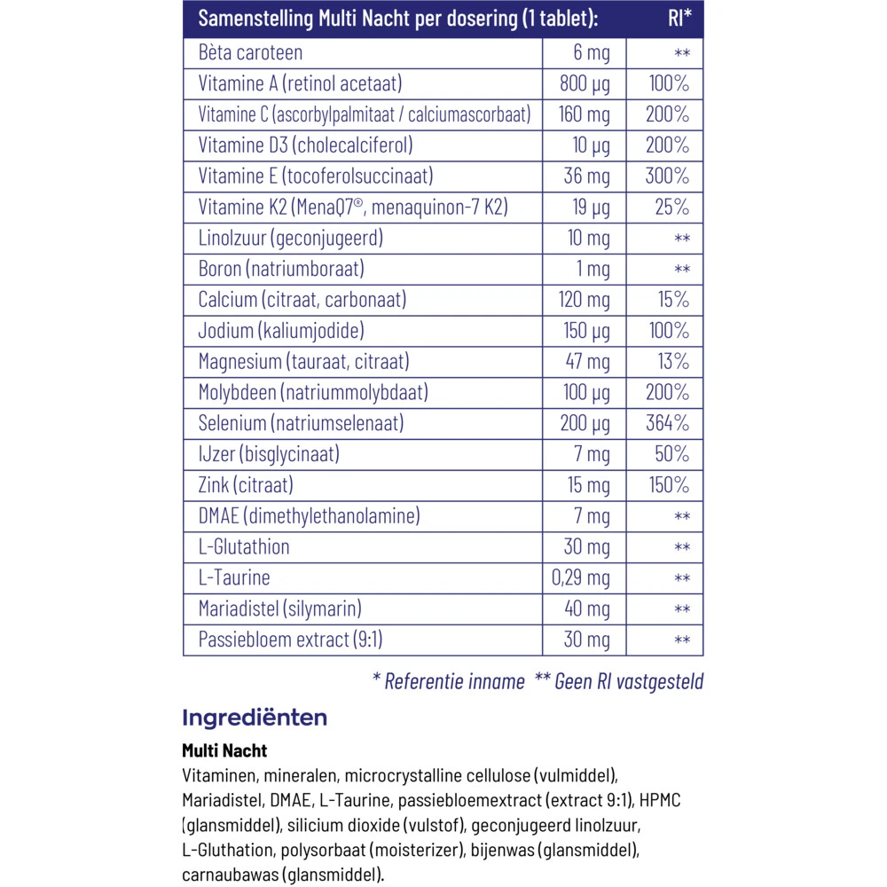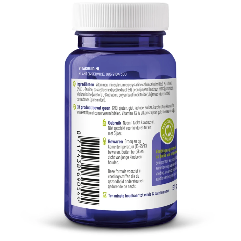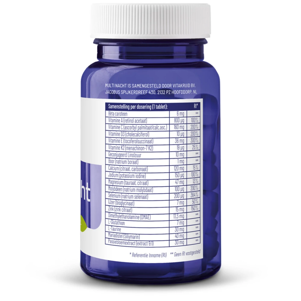 Vitakruid Multi NachtVitakruid Multi Nacht is een vitamine supplement met daaraan kruiden en planten toegevoegd. Multi Nacht ondersteunt het lichaam om u0027s nachts te herstellen en helpt bij een gezonde nachtrust. Multi Nacht bevat onder andere vitamine D, voor de opbouw van sterke botten*, vitamine A, voor het herstellend vermogen van de huid* en passiebloemextract om rust en slaap op te wekken**. Uitgekiende formule voor de nachtSynergetische werking door combinatie K2 & D3Pa