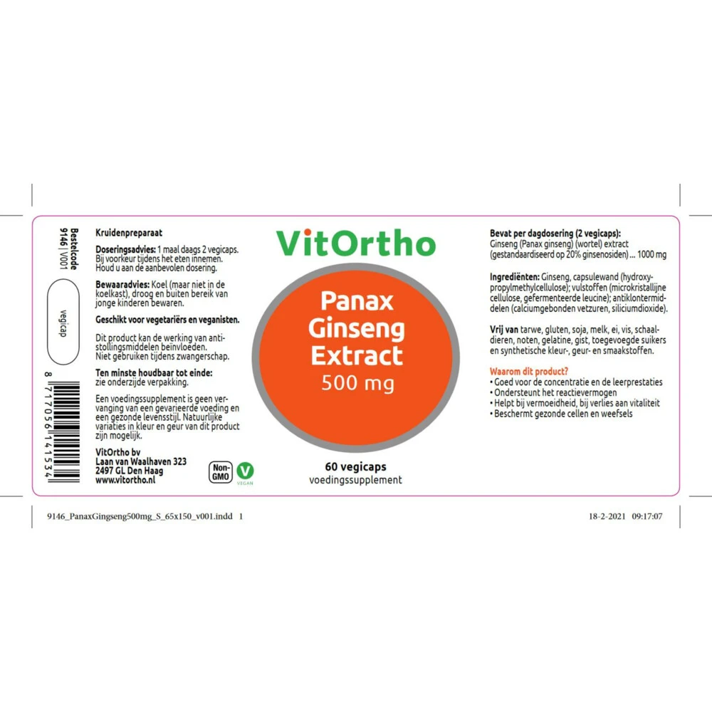 Vitortho Panax Ginseng ExtractPanax Ginseng Extract 500 mg van Vitortho is een kruidenpreparaat met Gingseng. Aan Ginseng wordt in China en Japan al duizenden jaren bijzondere krachten toegeschreven. Kenmerken van Vitortho Panax Ginseng ExtractDagelijks gebruik van 1000 mg Panax ginseng of meer is goed voor de concentratie en voor de leerprestaties* (EFSA-ID 3668, 3870).Ondersteunt het reactievermogen* (EFSA-ID 3673).Helpt bij vermoeidheid, bij verlies aan vitaliteit* (EFSA-ID 3674, 3